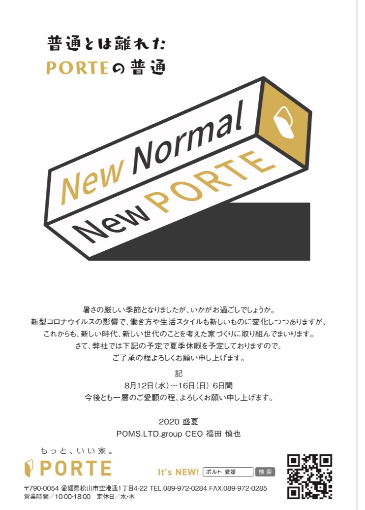 暮らしの提案2020.08.12 暑中見舞い・おうちLABO放送 南海放送 「おうちLABO」にて PORTEの新しいHIRAYAが誕生。 回遊できる間取りの家事動線 ロフトや無垢の学習机など自然の中に自然素材のおうち。 放送日は勝手ながら夏季休暇をいただいていますが、メールでのご予約を 受け付けています。 ぜひ完成見学会に、避暑地「久万高原町」へお越し下さい。